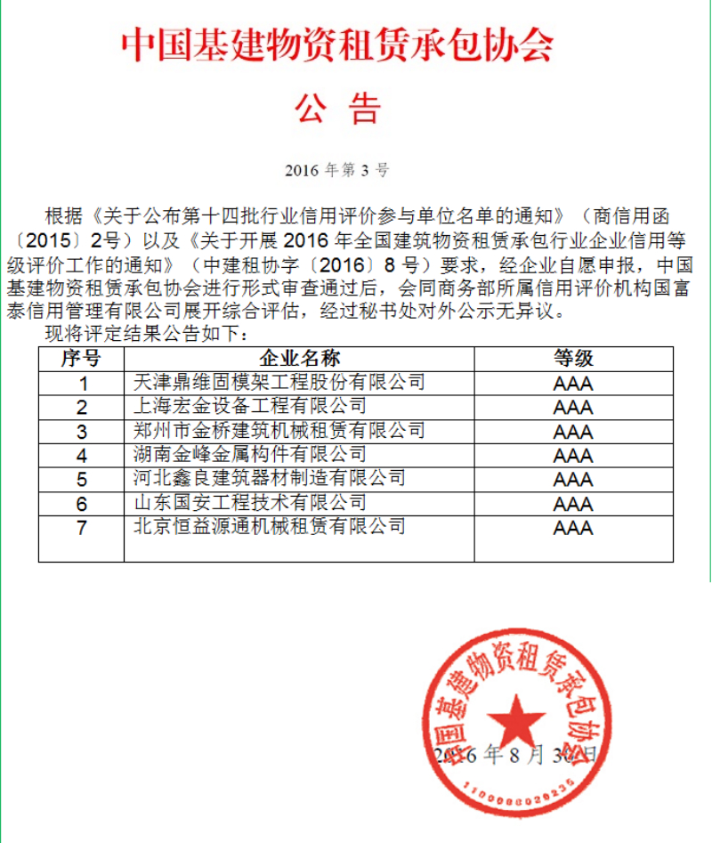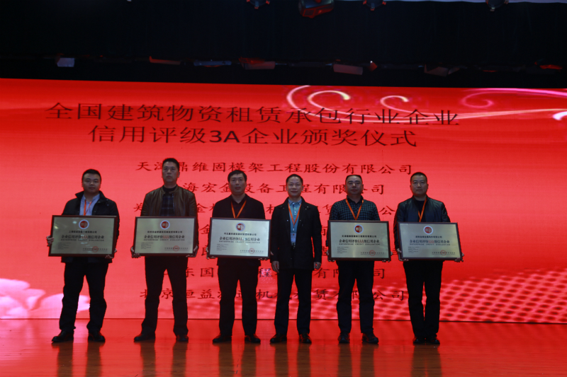 之后,協會宣布了通過評定的全國建筑物資租賃承包行業(yè)第一批信用評級3A企業(yè),我公司——北京恒益源通機械租賃有限公司——也榮登此榜單,獲得又一新的榮譽,協會領導為3A級企業(yè)頒發(fā)了獎牌與榮譽證書。
